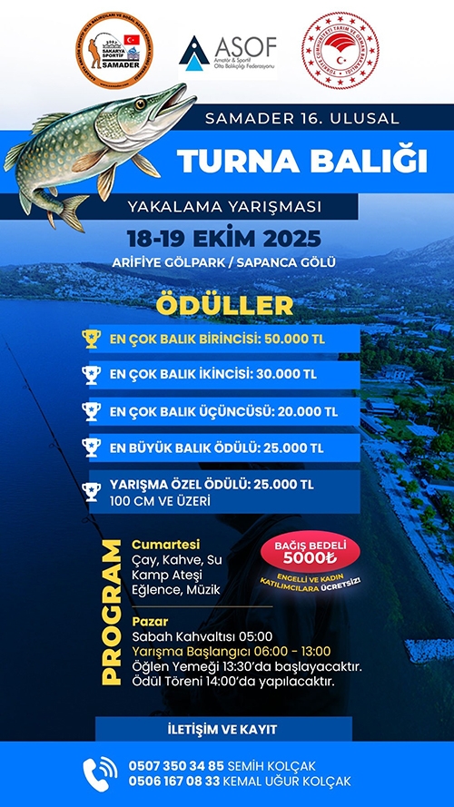 Federasyonumuz üyesi Sakarya Amatör Sportif Olta Balıkçıları ve Doğal Hayatı Koruma Kulübü Derneği – SAMADER tarafından Sapanca Gölü’nde düzenlenecek olan SAMADER 16. Ulusal Turna Balığı Yakalama Yarışması’na tüm doğa aşığı sportif olta balıkçılarını bekleriz.